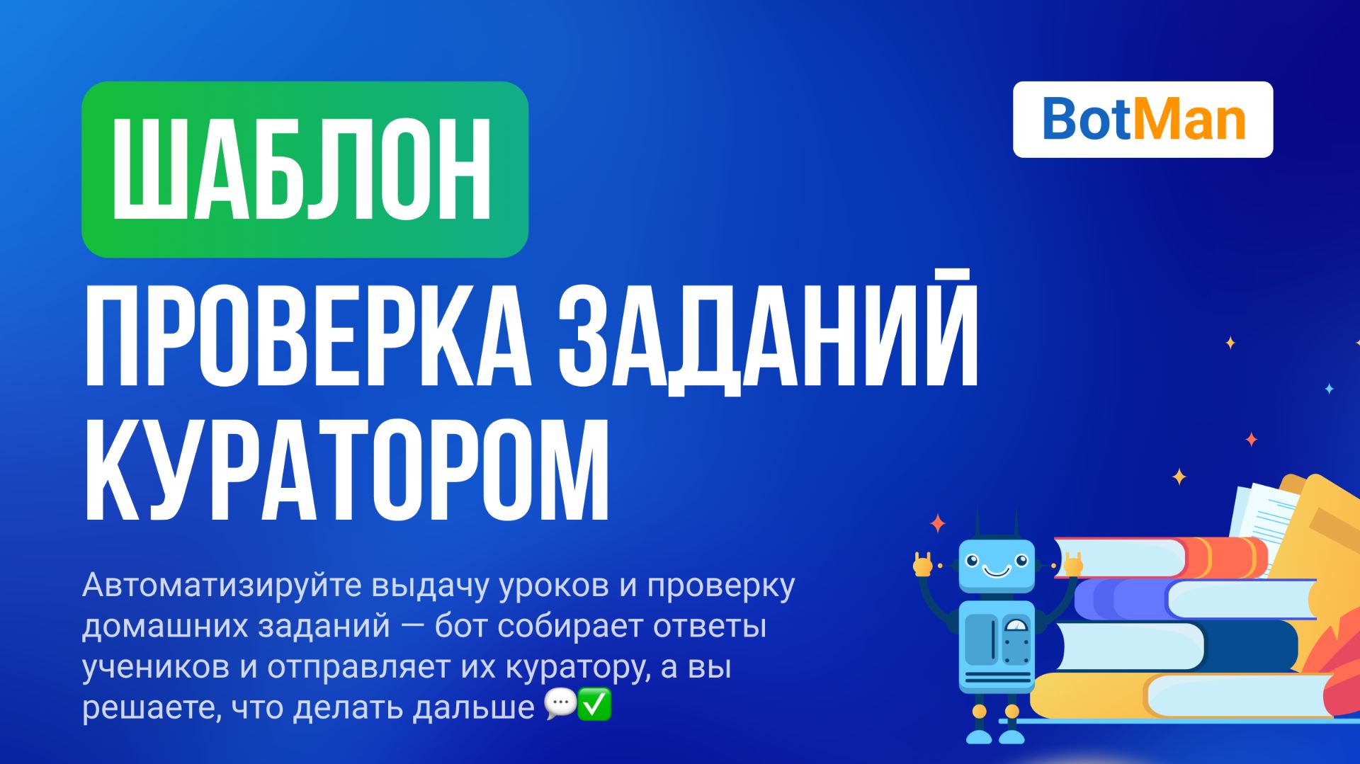 📚 Новый бот для проверки домашних заданий! 💡Мы подготовили уникальный шаблон бота, (https://app.botman.pro/app/template/view/5dbgbqfdgtv9muaq) который поможет вам отправлять задания ученикам и получать их ответы для проверки! шаблон: https://app.botman.pro/app/template/view/5dbgbqfdgtv9muaq 🤖Этот бот идеально подходит для тех, кто обучает других и хочет эффективно контролировать процесс. Например, вы провели урок или тест, и прежде чем перейти к следующему, хотите проверить ответы ваших подписчиков. С нашим ботом это стало проще простого! ❓Где пригодится: 🔵Кураторам и репетиторам для автоматизации обучения. 🔵Экспертам и специалистам, желающим повысить вовлеченность учеников. 🔵Онлайн-школам, стремящимся интегрировать кураторов в воронку продаж для увеличения взаимодействия. Не упустите возможность улучшить процесс обучения!
