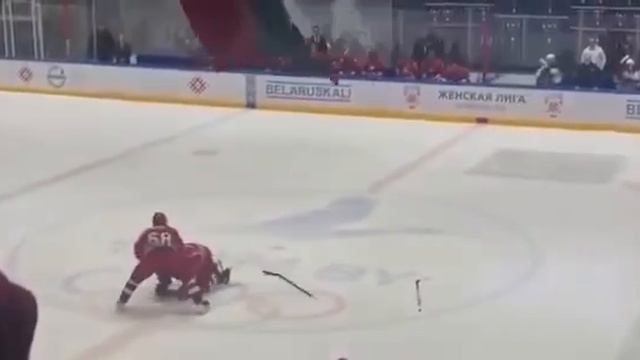 На кадрах видно, что игрок команды президента под номером 68 — бывший участник белорусской сборной по хоккею Ярослав Чуприс — спиной задевает Лукашенко, и тот падает. Чуприс помогает ему встать. Подписаться на нас в Telegram: https://t.me/stormdaily Наш сайт: https://dailystorm.ru/