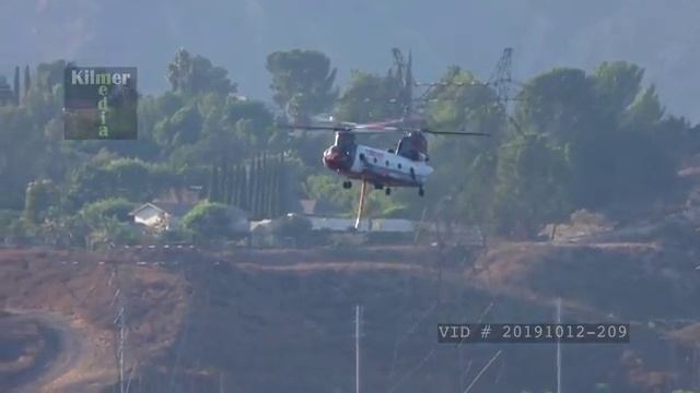Los Angeles, CA / USA - Oct. 12, 2019: A CH-47 Chinook firefighting helicopter, operated by Billings Flying Service, arrives at the Van Norman Reservoir in L.A. to refill its water tank during the Saddleridge Fire. video licensing (editorial, news-type uses only): https://www.shutterstock.com/video/clip-1039063160/?ref=2810893