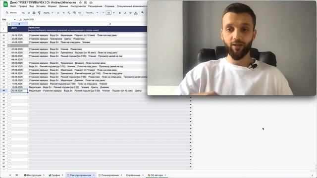 Хотите выработать привычки и с удовольствием наблюдать за своим прогрессом? Наш шаблон Google Таблиц «Трекер привычек» — идеальное решение! Главная особенность этого трекера в том, что вы составляете план, а таблица автоматически выводит его на удобный, бесконечный график с прогрессом. Вам останется только наблюдать, как ваши усилия превращаются в наглядный результат. Я, Андрей Лиханов, автор шаблонов Google Таблиц, покажу, как с помощью этого инструмента вы сможете: - Поставить цели и спланировать привычки. - Автоматически отслеживать прогресс на наглядном графике. - Сохранять мотивацию, так как процесс становится увлекательным и интересным. Этот трекер идеально подходит для личной продуктивности, саморазвития и для тех, кто ищет эффективные инструменты для достижения целей. 👉 Получите шаблон «Трекер привычек» и начните меняться! Переходите на сайт и скачивайте: prosheets.ru/lichnye-tablitsy/treker-privychek Там вы найдёте не только эту таблицу, но и другие полезные шаблоны, лайфхаки по Google Таблицам и советы по автоматизации. Подписывайтесь на наш канал в Telegram, чтобы не пропустить новинки!