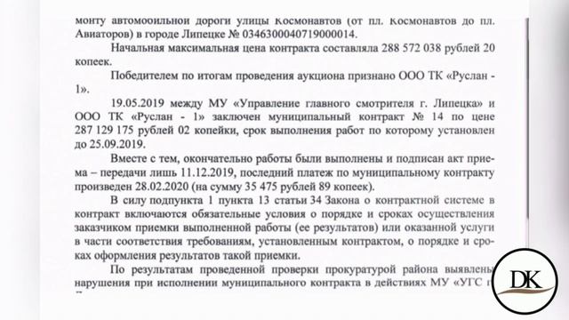 После обращения в генеральную прокуратуру, а также областную прокуратуру Липецкой области и публикации мною видео, по поводу нарушений действующего законодательства о контрактной системе в сфере закупок при выполнении работ по ремонту автомобильной дороги ул. Космонавтов (от пл. Космонавтов до пл. Авиаторов) в городе Липецке. Установлено, что 23.03.2019 года на официальном сайте гос. закупок опубликовано извещение о проведении открытого аукциона. Номер контракта 0346300040719000014. Победителем по итогу аукциона, признано ООО ТК «Руслан-1». Окончательные работы были приняты и подписан акт приема передач 11.12.2019 года. По результатам проведённой проверки, прокуратурой района выявлены нарушения, при исполнении муниципального контракта, в действиях МУ «УГС г. Липецка», в том числе при проведении экспертизы по приемке выполненных работ. В целях устранения выявленных нарушений в адрес главы администрации города Липецка внесено представление, рассмотрение которого находится на контроле прокуратуры района. Относительно доводов Моего обращения по соответствию используемых материалов в смете и проектно-сетной документации в настоящее время Счётной палатой города Липецка, по поручению прокуратуры района, проводится проверка, о результатах которой Мне будет сообщено дополнительно. А также напомню, что после публикации видео про ул. Космонавтов, и Проспект Победы, от высокопоставленных чиновников города Липецка, мне поступали неоднократно угрозы, а моей супруге был прислан похоронный венок с запиской угрозы жизни всей семье.