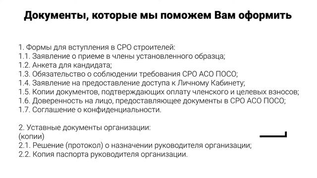 Перечнь необходимых документов для вступления и получения допуска СРО строителей в Москве Условия и документы: https://np-poso.ru/usloviya-dokumenty-dlya-vstupleniya-v-sro/ Вступление в СРО строителей: https://np-poso.ru/vstuplenie-v-sro/ Допуск СРО в строительстве: https://np-poso.ru/dopusk-sro/ Стоимость: https://np-poso.ru/stoimost-vstupleniya-v-sro/