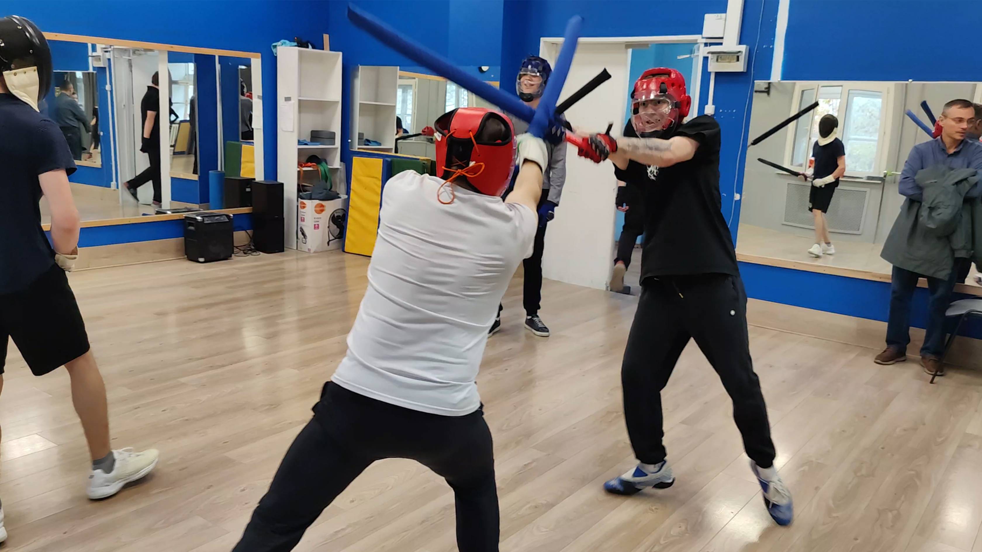 Спарринг на длинных плоских двуручных японских мечах чанбара катана в школе кэндзюцу Katana Club