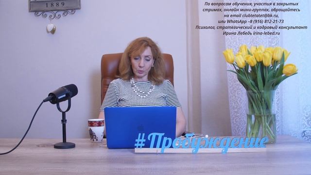 Больше сгруппированных видео по темам есть внизу: ➤ Ирина Лебедь - психолог, стратегический консультант. Опыт работы в области практической психологии – более 25 лет. ➤ Официальный сайт психолога Ирины Лебедь - http://www.irina-lebed.ru/ ➤ Видеосеминары Ирины Лебедь - http://www.irina-lebed.ru/obuchenie/ ✆ Как ещё можно с нами связаться: ✦Skype: irina.tetatet ✦Email: clubtetatet@bk.ru ✦WhatsApp: +7 (916) 812-21-73 ✦Instagram: https://www.instagram.com/irinalebed.probuzhdenie/ ✦Facebook: https://www.facebook.com/club.tetatet ✦ВК: https://vk.com/club38480683 ✦Instagram: https://www.instagram.com/irinalebed.probuzhdenie/ ✦Twitter: https://twitter.com/Clubtetatet ✦ЖЖ: https://lirina.livejournal.com/ ✦YouTube канал: https://www.youtube.com/user/clubtetatet/featured ✒ По вопросам приобретения занятий и видеосеминаров Ирины Лебедь оставляйте заявки на почту: clubtetatet@bk.ru ➤ Проект ПРОБУЖДЕНИЕ рассчитан на год. За этот период: мы обретаем способность управлять собственной жизнью; - учимся распознавать, классифицировать людей по их природе, действиям, словам; - выстраиваем честные и понятные отношения; - ставим правильно цели и достигаем их в кратчайшие сроки; - уходим от программной судьбы, понимаем, что происходит вокруг и знаем, что со всем этим делать. ➤ За подробностями и условиями участия в проекте обращайтесь на почту clubtetatet@bk.ru. ✒ Запись на презентационную Skype-встречу о проекте также производится по почте clubtetatet@bk.ru или WhatsApp: +7 (916) 812-21-73 ➤ Презентация проекта "Пробуждение" и краткое содержание: https://youtu.be/Tu88Jxr_-dw ➤ Презентация обучения в мини-группе на проекте: https://youtu.be/F6GDigC9uUY ➤ Описание и содержание занятий: https://irina-lebed.ru/proekt-probuzhdenie/ ➤ ПЛЕЙЛИСТЫ по группам видео: 0. Презентации программ, семинаров и проектов: https://youtube.com/playlist?list=PLEISaR6AjsIg-Wo5iOnoPqq_KC17GF2VS 1. Секреты счастливых отношений:https://youtube.com/playlist?list=PLEISaR6AjsIhRJmAtlCPS_bEVzaYQN4L1 2. Муж и жена. Семья и отношения в ней: https://youtube.com/playlist?list=PLEISaR6AjsIifKYoxBt6hIDG2H0E83Dxu 3. Отношения с матерью: https://youtube.com/playlist?list=PLEISaR6AjsIivB5UcLfVyCFk594Z9cIC5 4. Отношения с отцом: https://youtube.com/playlist?list=PLEISaR6AjsIjktuBOZ9X8oTwQDQwQhpMJ 5. Страхи. Как перестать бояться?: https://youtube.com/playlist?list=PLEISaR6AjsIhRJmAtlCPS_bEVzaYQN4L1 6.Уверенность и самооценка: https://youtube.com/playlist?list=PLEISaR6AjsIiOLUwtqkDER6V6VJ1w5IRL 7. Мышления и убеждения. Как изменить: https://youtube.com/playlist?list=PLEISaR6AjsIjEjFD4qP__xLnvHdri77z2 8. Деньги и достаток: https://youtube.com/playlist?list=PLEISaR6AjsIheomC7eHNSiSGvzxEBiqrC 9. Как достичь желаемого: https://youtube.com/playlist?list=PLEISaR6AjsIinCh0w4NNspoPvNAok6mHx 10. Фрагменты проекта "Пробуждение": https://youtube.com/playlist?list=PLEISaR6AjsIgbe-vfZUVE8nHzwEyJGa8r 11. Презентации занятий проекта "Пробуждение": https://youtube.com/playlist?list=PLEISaR6AjsIipxPpRrCDmZwzX42MHESjB 12. Публичные консультации: https://youtube.com/playlist?list=PLEISaR6AjsIgktWzUVWeal5hcLS989dFe А также: "Как изменить привычки", "Прошлое, настоящее и будущее", "Как обрести силу", "Как достичь цели", "Психология стройности", "Женственность и женская природа", "Управление эмоциями, личные границы", "Как принять и поверить в себя", "Стримы", "Ответы на вопросы","Отношения со свекровью", "Семинары" и другие. Позвольте себе жить!