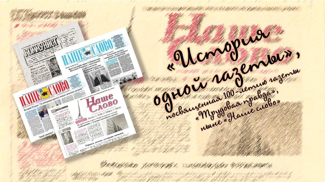 В городе Энгельсе, как и во многих других городах, есть свои газеты. И одна из них, «Наше слово - газета для всех и для каждого», в сентябре 2022 года, отмечает столетний юбилей! С 17 сентября 1922 года, когда начался регулярный выпуск газеты «Трудовая правда», появившейся вследствие включения Покровска на правах столицы в новое республиканско-территориальное образование - Область немцев Поволжья (с января 1924 года — Республика немцев Поволжья). Об этапах жизни нашей газеты, ее сотрудниках – презентация филиала №9.