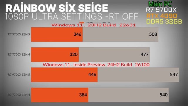 RYZEN R7 9700X vs RYZEN R7 7700X Gaming Test | Windows 11 Build 22630 vs Build 26100 | HOW MUCH WİNDOWS UPDATE AFFECTS GAMİNG ON AMD 9000 series and Zen4 the Impact of windows on Zen5 & Zen4 --- It was recently discovered that branch prediction optimizations in the upcoming Windows 11 version 24H2 can significantly boost performance on AMD-powered computers. The sad thing is that Windows 11 version 24H2 is still not available to the general public. While we wait for Microsoft to release 24H2 to all users sometime later this year, AMD has some interesting news for Ryzen customers. As it turned out, the latest non-security update for Windows 11 backports branch prediction optimization from Windows 11 24H2 to Windows 11 23H2. As a result, after installing KB5041587, you should see free performance uplifts on your computer with a Ryzen 7000 or Ryzen 9000 Series processor. ------------------ Are you ready to dive into the ultimate gaming showdown between the **9700X** and **7700X**? In this video, we put these powerful CPUs to the test on ** Windows 11 Build 22630** VS **Build 26100** to see how these different versions impact gaming performance on **Zen5** and **Zen4** architectures. Whether you're a gaming enthusiast or a tech geek, this detailed comparison will give you the insights you need to choose the best setup for your gaming rig! **🔍 What You'll Learn:** - **Gaming performance** differences between **Zen5 9700X** and **Zen4 7700X**. - How **Windows 11 Build 22630** and **Build 26100** affect your gaming experience. - In-depth **CPU specifications** and what they mean for gaming. - Tips to optimize your gaming setup with these CPUs. **💻 CPU Specs:** - **AMD Ryzen 9 9700X**: **12 cores**, **24 threads**, **Base Clock: 4.8 GHz**, **Boost Clock: 5.7 GHz**, **TDP: 170W**. - **AMD Ryzen 7 7700X**: **8 cores**, **16 threads**, **Base Clock: 4.5 GHz**, **Boost Clock: 5.4 GHz**, **TDP: 105W**. Whether you're upgrading your system or just curious about how these CPUs stack up against each other, this video is packed with valuable insights and actionable advice! **📢 Don't Forget:** - **Like** if you enjoyed the video! - **Subscribe** for more in-depth tech reviews and comparisons! - **Comment** your thoughts on which CPU you're rooting for! **Hashtags:** #9700Xvs7700X #Zen5 #Zen4 #Windows11Gaming #CPUTest #GamingPerformance #AMD #PCGaming #TechReview #Win11Build22630 #Win11Build26100 Music from #InAudio: https://inaudio.org/ Infraction- Almost Evil Music provided by Infraction No Copyright Music Spotify: https://spoti.fi/3gJIh0R --- Теги: 9700x vs 7700x,ryzen 7 9700x,9700x,9600x vs 9700x,ryzen 9700x,ryzen 7 7700x vs 9700x,ryzen 7 9700x review,ryzen 7 9700x vs ryzen 7 7700x,r7 9700x,7900x vs 7700x,amd ryzen 9700x,ryzen 7 7700x v 9700x,ryzen 5 9600x,amd 9700x,7700x v 9700x,windows 11 26100,windows 11 version 24h2,windows 11 24h2 2024,windows 11 23h2,windows 11 2024,windows 11 24h2,new windows 11 24h2,windows 11 24h2 fixes,windows 11 new update,windows 11 24h2 update