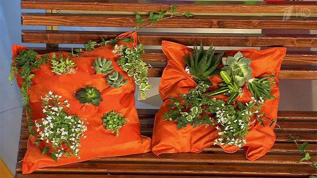 Цветы необязательно сажать в землю или в горшок, можно использовать обычную старую подушку. Такая композиция украсит любой сад! А всего-то и надо — немного мха и соломы… Полный выпуск смотрите здесь ﹥﹥