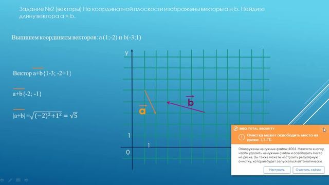 ДОСРОЧНЫЙ ВАРИАНТ ЕГЭ ПО МАТЕМАТИКЕ 2026 27.03.2026 профильный уровень Задание №2 (векторы) На координатной плоскости изображены векторы a и b. Найдите длину вектора a + b.
