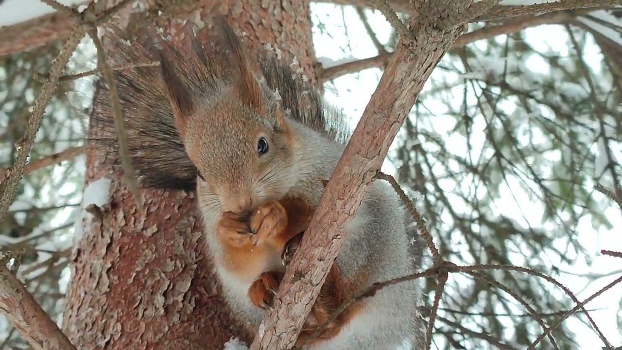 Пушистая белочка в снежинках