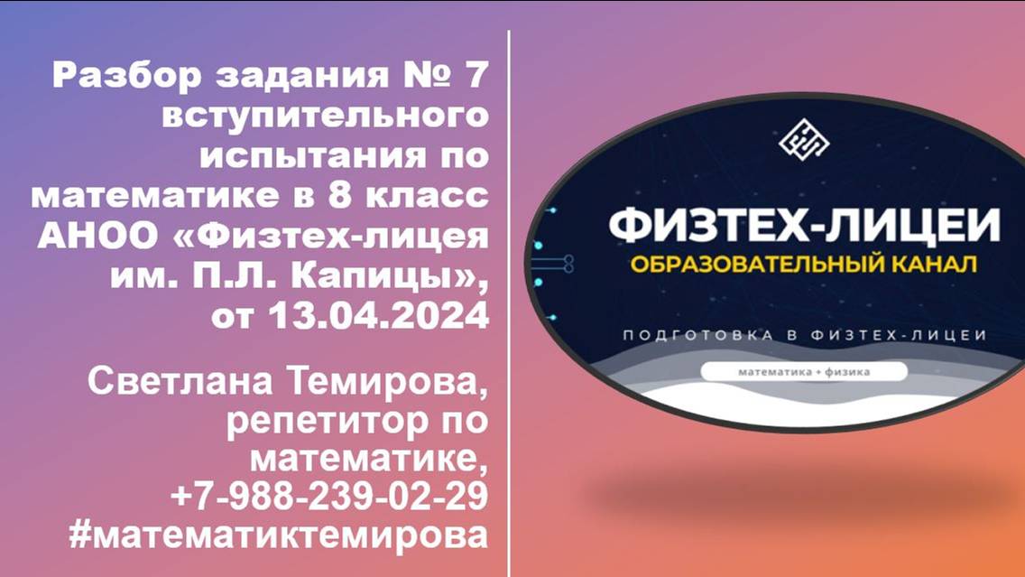 Как поступить в Физтех-лицей? Уметь решать сложные и нестандартные задания. Разбор вступительного варианта в "Физтех-лицей им. П.Л. Капицы", г. Долгопрудный. Решение будет полезным для учеников 7 класса и их родителей. Всем, кто готовится к поступлению в профильные школы, где на экзамене нужно продемонстрировать умение решать задания повышенной сложности. Светлана Темирова, +7-988-239-02-29 (Телеграм, ватсапп) #математиктемирова