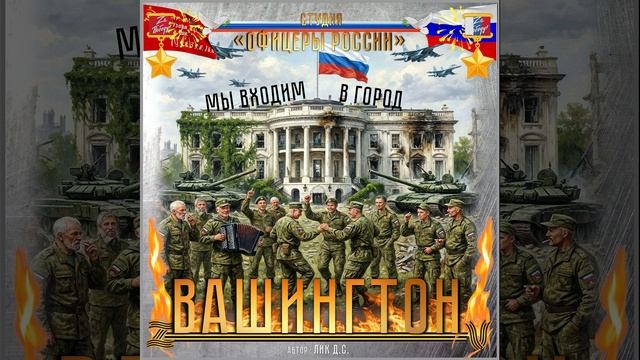 Мы входим в город Вашингтон! Стоят Арматы тихо в сквере, Капитолийский холм дымит. Левей майор на БТРе, О чем то важном говорит. Вокруг десантники толпятся, Играет русская гармонь. Поют на русском и бранятся, Ура звучит со всех сторон. Припев Ура... Hоссийскому солдату ! Мы входим в город Вашингтон! Приказ!.. За спину автоматы! Достать из танка Триколор! Ну что допрыгались ребята, Мы вам твердили с давних пор. Ура... Российскому солдату ! Ну здравствуй город Вашингтон! Ура... Российскому солдату ! Мы входим в город Вашингтон! Сидит у клумбы сонный Байден, Да трудный выдался денёк. И с идиотским детским взглядом, Жуёт солдатский сухпаёк. С ним рядом Стармер, Мерц с Макроном, Жуют галеты натощак. Вокруг разбросаны патроны, И тлеет НАТОвский общак. Владимир тихо отвечает, На причитания "ZараZ" Войнушки мы не начинаем, А завершаем их у вас! Всегда мечтал об этом фото, На заднем фоне "Белый дом". Я в камуфляже с автоматом, В руке российский триколор! Лик Д.С.