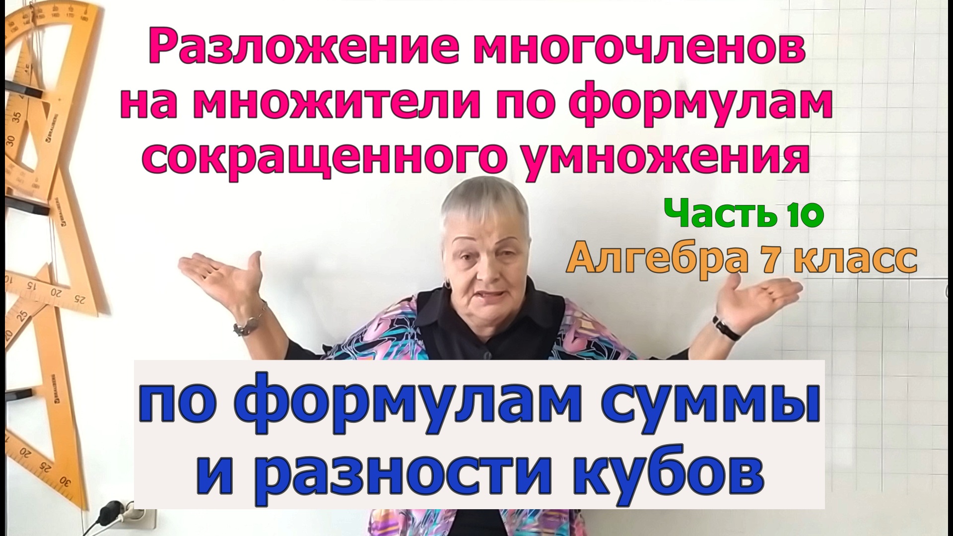 Алгебра 7 класс. Как разложить многочлен на множители с помощью формул сокращенного умножения суммы кубов и разности кубов? Сегодня, продолжая говорить о разложении многочленов на множители, мы ответим на этот вопрос. А чтобы Вы легко поняли и запомнили новый материал, вначале мы напомним Вам, как получаются формулы суммы кубов и разности кубов. Обратим Ваше внимание на то, чем отличаются формулы суммы и разности кубов. Дадим подсказки, которые помогут Вам находить в упражнениях формулы суммы кубов и разности кубов. На примере 6 упражнений мы подробно объясним Вам все нюансы разложения многочленов на множители по формулам суммы кубов и разности кубов. План урока и ссылки на предыдущие уроки Вы можете найти в описании под видео. 00:00 Начало видео. 00:32 Вспомним, как получаются формулы суммы кубов и разности кубов. 03:41 Как применять формулы суммы кубов и разности кубов при разложении многочленов на множители? 05:39 Как искать формулы суммы кубов и разности кубов? 09:20 Упражнение 1. 12:06 Упражнение 2. 14:03 Упражнение 3. 16:08 Упражнение 4. 18:45 Упражнение 5. 20:28 Упражнение 6. 23:15 Подсказка для поиска формул суммы кубов и разности кубов. 23:48 Домашнее задание. Если Вы впервые на нашем канале или не смотрели предыдущие уроки, то рекомендуем Вам посмотреть следующие видео: Разложение многочленов на множители по формулам сокращенного умножения (квадрата суммы и квадрата разности). Часть 9. Алгебра 10-11 класс. https://rutube.ru/video/c74da7a4f2a13ffc00c19a969d597f78/ Разложение многочленов на множители по формулам сокращенного умножения (квадрата суммы и квадрата разности). Часть 8. Алгебра 9 класс. https://rutube.ru/video/842621ac145cd341796d02794fd1c845/ Разложение многочленов на множители по формулам сокращенного умножения (квадрата суммы и квадрата разности). Часть 7. Алгебра 7 класс. https://rutube.ru/video/63b28750459aa583eb525c7086a4ff39/ Разложение многочленов на множители по формулам сокращенного умножения (разности квадратов). Часть 6. Алгебра 8-11 класс. https://rutube.ru/video/fb2b71b55629739c9fcfe3dd41f51c0c/ Разложение многочленов на множители по формулам сокращенного умножения (разности квадратов). Часть 5. Алгебра 7 класс. https://rutube.ru/video/97a3410dd67f08691a3b148db5470edc/ Что такое разложение многочленов на множители. Как разложить одночлен на множители. Алгебра 7 класс. https://rutube.ru/video/e8012f424fccab7e8fc5e2506d4c7043/ Как вынести общий множитель (одночлен) за скобки. Разложение многочленов на множители. Часть 2. Алгебра 7 класс. https://rutube.ru/video/6d0a0ce6953e9a62a7dc0150ad3c1592/ Как вынести общий множитель (многочлен) за скобки. Разложение многочленов на множители. Часть 3. Алгебра 7 класс. https://rutube.ru/video/0e8aff292a37999c69c4a5831d4db654/ Разложение многочленов на множители. Способ группировки. Часть 4. Алгебра 7 класс. https://rutube.ru/video/614f1f9034150f4a7d271256ec96f6c7/ Алгебра 7 класс. Формулы сокращенного умножения. Разность квадратов двух выражений. Примеры упражнений. Урок 2 из 5. https://rutube.ru/video/077de8010f04048a811f020e83592df8/ Выражения с переменной. Как прочитать и объяснить выражения с переменной. Примеры выражений. Алгебра 7 класс. https://rutube.ru/video/54eeec3323dd2c19949e3521329bfb2f/ #РазложениеМногочленовНаМножителиПоФормулеСуммыКубов #РазложениеМногочленовНаМножителиПоФормулеРазностиКубов #разложениенамножителипоформуламсокращенногоумножения7 #РазложениеНаМножителиПоФормулеСуммыКубов #РазложениеНаМножителиПоФормулеРазностиКубов #РазложениеНаМножителиПоФормулеСуммыКубов7 #РазложениеНаМножителиПоФормулеРазностиКубов7 #РазложениеМногочленовНаМножители7 #