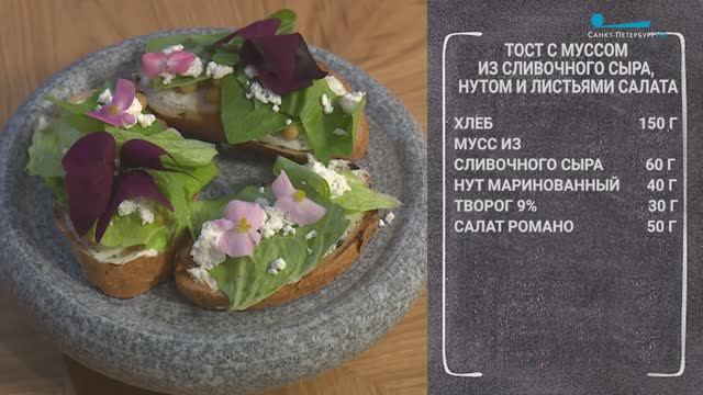 Шеф-повар Виктор Хомылев предлагает приготовить тосты с муссом из сливочного сыра, нутом и листьями салата.