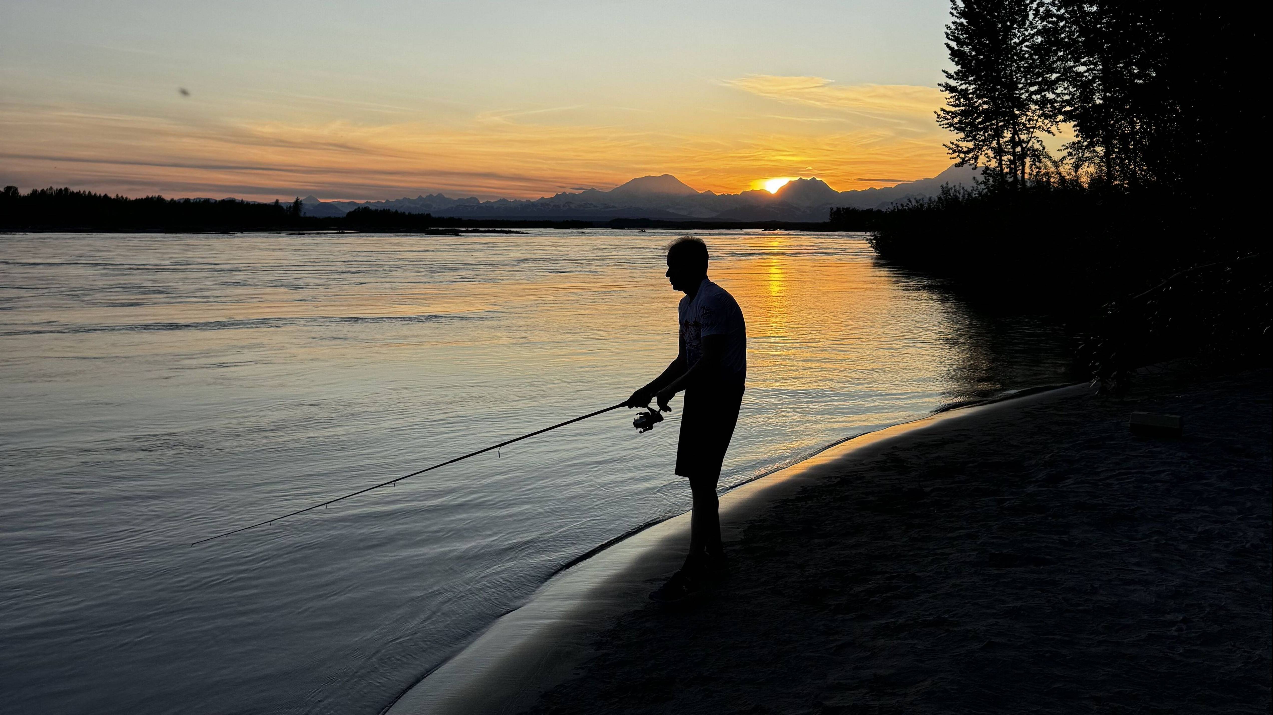 Команда 7 Summits Club отправилась на рыбалку. Мы не поймали ни одной рыбы, но зато застали потрясающий закат над горами: Форейкер, Хантер и Денали.