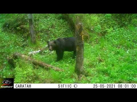 Фоторегистратор запечатлел двух взрослых бурых медведей в одном кадре. Крупный, темный — самец, помельче, бурая — самка. Такое поведение характерно для периода гона, который начинается обычно в конце мая, заканчивается в начале июля. Установка фоторегистратора - государственный инспектор С. Кульбацкая.