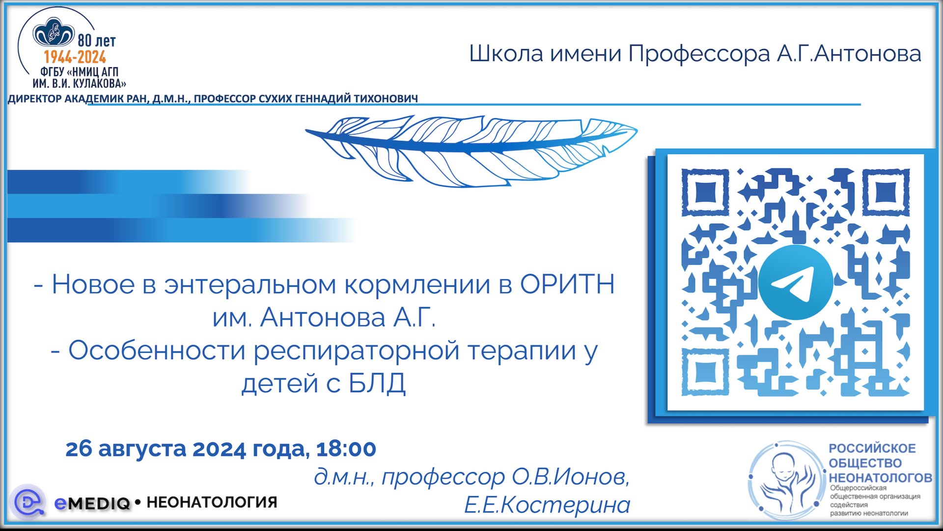 eMediQ • Неонатология | Школа им.Профессора А.Г.Антонова. Новое в энтеральном кормлении + БЛД новые КР + профилактика РСВ ВНИМАНИЕ! Данный материал предназначен только для действующих специалистов здравоохранения! © О.В.Ионов, eMediQ Спикеры: - д.м.н., профессор ИОНОВ Олег Вадимович - Заведующий отделением реанимации и интенсивной терапии новорожденных имени профессора А.Г.Антонова Института неонатологии и педиатрии ФГБУ «Национальный медицинский исследовательский центр акушерства, гинекологии и перинатологии им.В.И.Кулакова» Минздрава России, профессор кафедры неонатологии Клинического института детского здоровья им.Н.Ф.Филатова Сеченовского университета, Председатель Общероссийской общественной организации содействия развитию неонатологии «Российское общество неонатологов» - КОСТЕРИНА Екатерина Евгеньевна, аспирант, врач-анестезиолог-реаниматолог отделения реанимации и интенсивной терапии новорожденных имени профессора А.Г.Антонова Института неонатологии и педиатрии ФГБУ «Национальный медицинский исследовательский центр акушерства, гинекологии и перинатологии им.В.И.Кулакова» Минздрава России 00:02:32 Новое в энтеральном кормлении в ОРИТН им. проф. А.Г.Антонова Е.Е.Костерина 00:57:48 Особенности респираторной терапии при БЛД у новорожденных О.В.Ионов 01:15:50 Иммунная защита глубоко недоношенных новорожденных с риском заболевания РСВ-инфекцией О.В.Ионов 01:20:25 Ответы на вопросы, заключение Наш канал в YouTube: youtube.com/emediq Подписывайтесь на наш Telegram-канал для неонатологов "Дыхание новой жизни" - мероприятия, анонсы, научные данные и исследования https://t.me/newLifeBreath Регистрируйтесь на образовательной платформе https://emediq.ru Ваши вопросы научным руководителям, а также предложения по проекту и тематикам направляйте на электронную почту ionov@emediq.ru © eMediQ