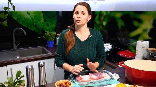 Рецепт: Мясо с салом кусок 1 кг Апельсины Яблоки Сухофрукты 100 гр Соль, перец Майонез 1 ложка Мед 1 ст. ложка Соевый соус 20-30 мл Лук 1 шт Рисовый уксус 2 чайные ложки