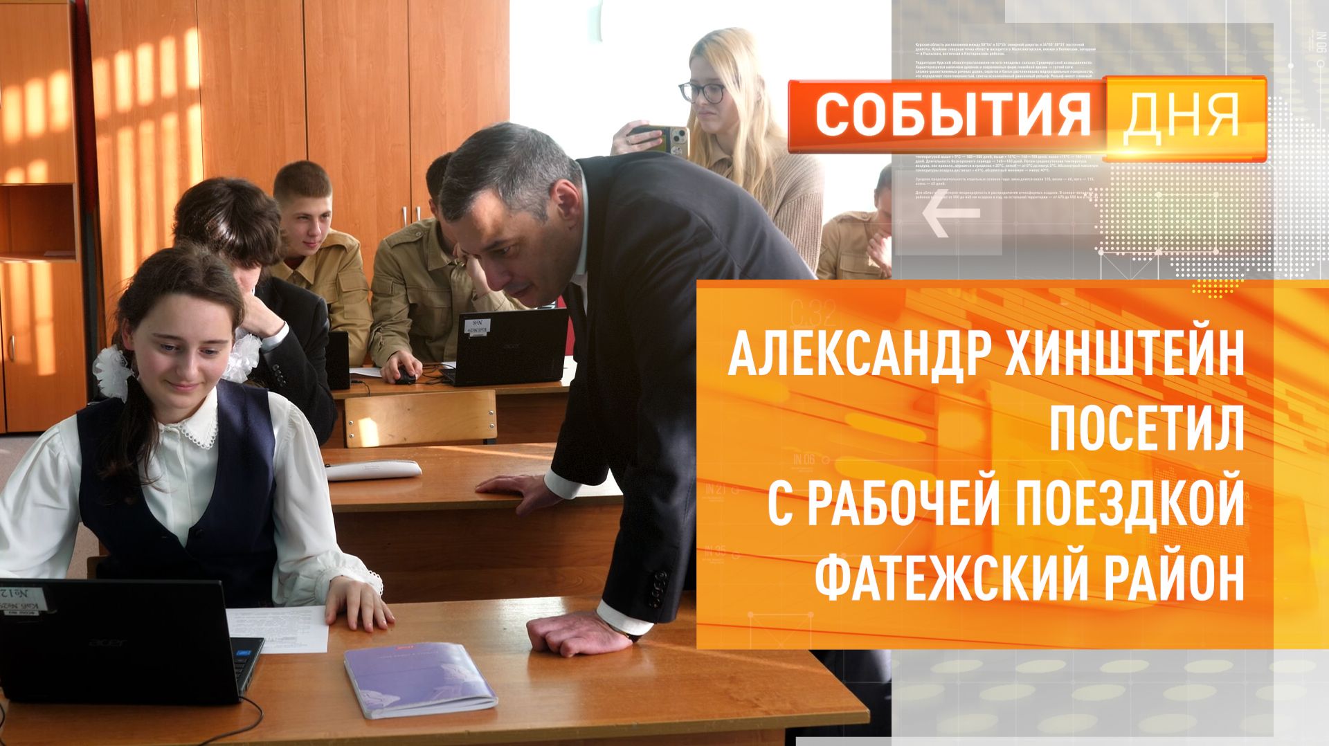 Александр Хинштейн с рабочей поездкой побывал в Фатежском районе. Губернатор посетил открывшуюся после капремонта 2-ую фатежскую школу. Ремонт выполнен в этом году по федеральной программе «Модернизация школьных систем образования» нацпроекта «Молодёжь и дети». А также осмотрел помещение для детской школы искусств.