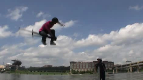 По-английски эта скакалка называется pogo stick. По-русски раньше называлось "Кузнечик", а как сейчас - неизвестно. Но прыгают на ней чуваки что надо!