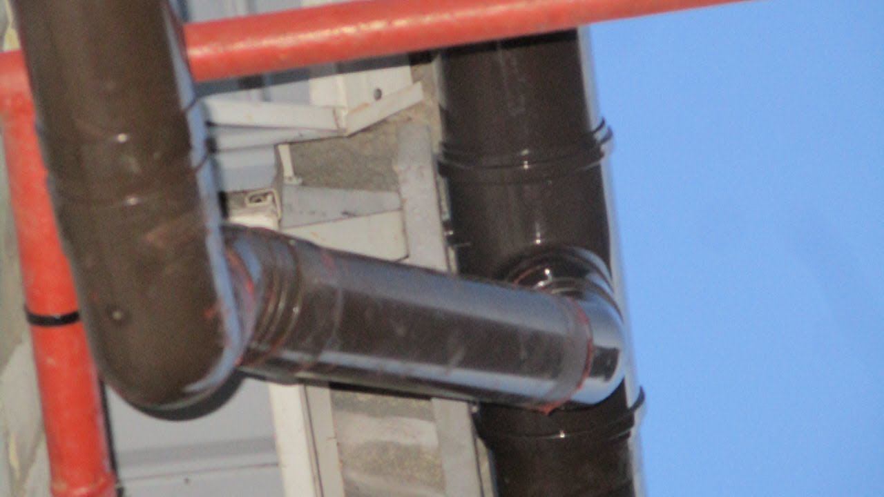 Стандартная система пластиковый водосток из Леруа на деревенскую нестандартную крышу под шифер.