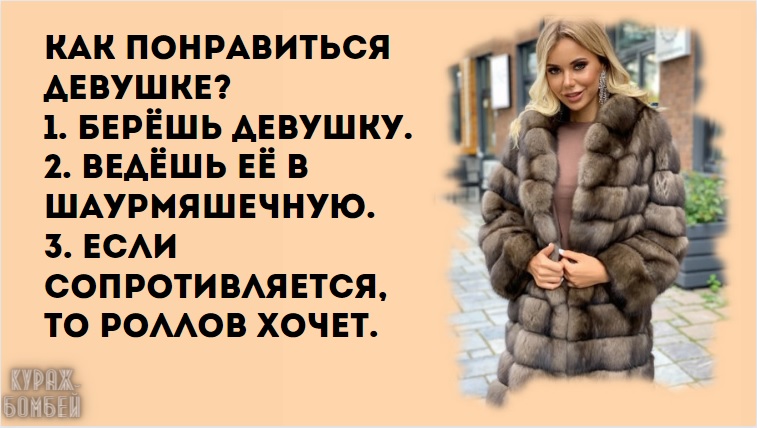 Всё, на чём написано "не содержит спирта", в России считается вредной химией. Хорошая кума — это служба новостей, ликёро-водочный отдел и центр психологической поддержки. И создал Бог женщину… И нет с того момента покоя ни мужчинам, ни Богу… Ошибки врачей лежат на кладбище, а ошибки учителей заседают в парламенте. Если вы считаете, что хуже уже быть не может, значит, у вас проблемы с воображением. Как понравиться девушке? 1. Берёшь девушку. 2. Ведёшь её в шаурмяшечную. 3. Если сопротивляется, то роллов хочет. Если долго не исполнять женские капризы, то женщина начнёт показывать фокусы!