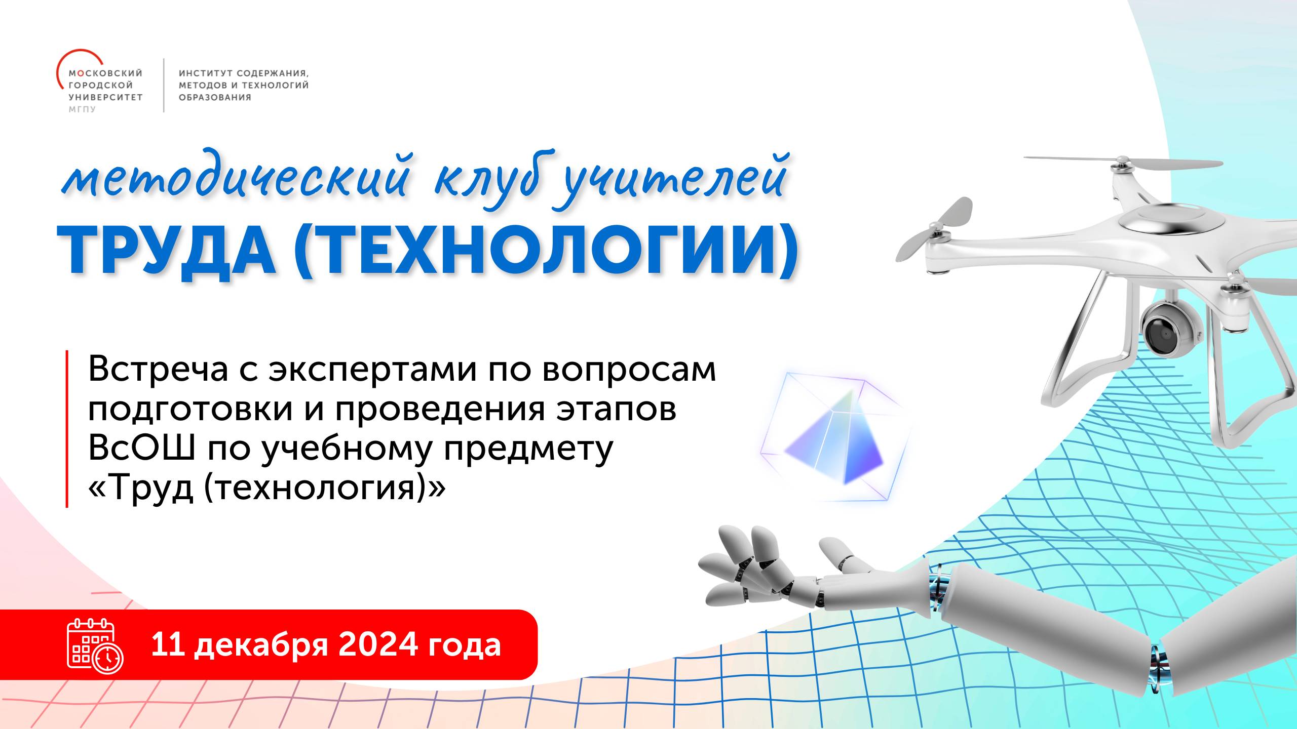 "Приглашаем учителей труда (технологии) к участию в заседании Методического клуба. Эксперты поделятся опытом подготовки и участия в этапах ВсОШ по профилям учебного предмета ""Труд (технология)"". Встреча состоится 11 декабря в 16:00. Спикеры встречи - эксперты ВсОШ: Юшкова Елена Александровна, Бутрякова Наталья Павловна, Прокопчук Игорь Леонидович. Модераторы встречи: Ямка Пётр Богданович, старший методист отдела методологии и перспективной дидактики ИСМиТО МГПУ; Созинова Екатерина Владимировна, методист отдела методологии и перспективной дидактики ИСМиТО МГПУ"