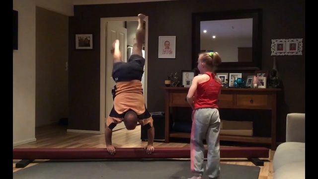 Отец копирует гимнастические упражнения дочери
