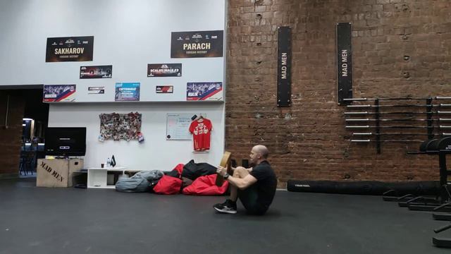 Подъем из положения лежа на спине на ноги с диском в руках