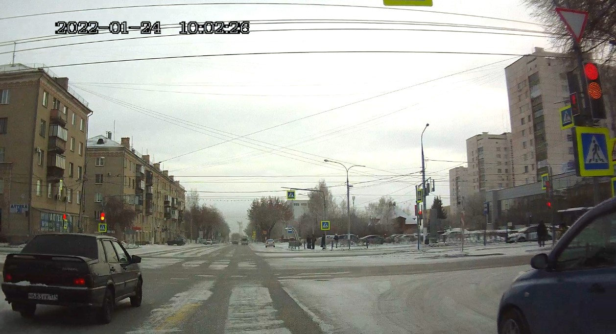 Пересечение стоп-линии и выезд на перекрёсток на запрещающий движение сигнал светофора. Госномер нарушителя Н683УК 174, LADA (ВАЗ) 2115 2007 г.в., графитовый металлик. Перекрёсток ул. Суворова и ул. Карла Маркса. 24-01-2022 п. 6.16 ПДД Дорожный знак "Стоп-линия". Место остановки транспортных средств при запрещающем сигнале светофора. п. 6.2. ПДД - жёлтый сигнал запрещает движение, красный сигнал запрещает движение, зелёный сигнал разрешает движение. п. 6.13 ПДД - при запрещающем сигнале светофора... водители должны остановиться перед стоп-линией (знаком 6.16).