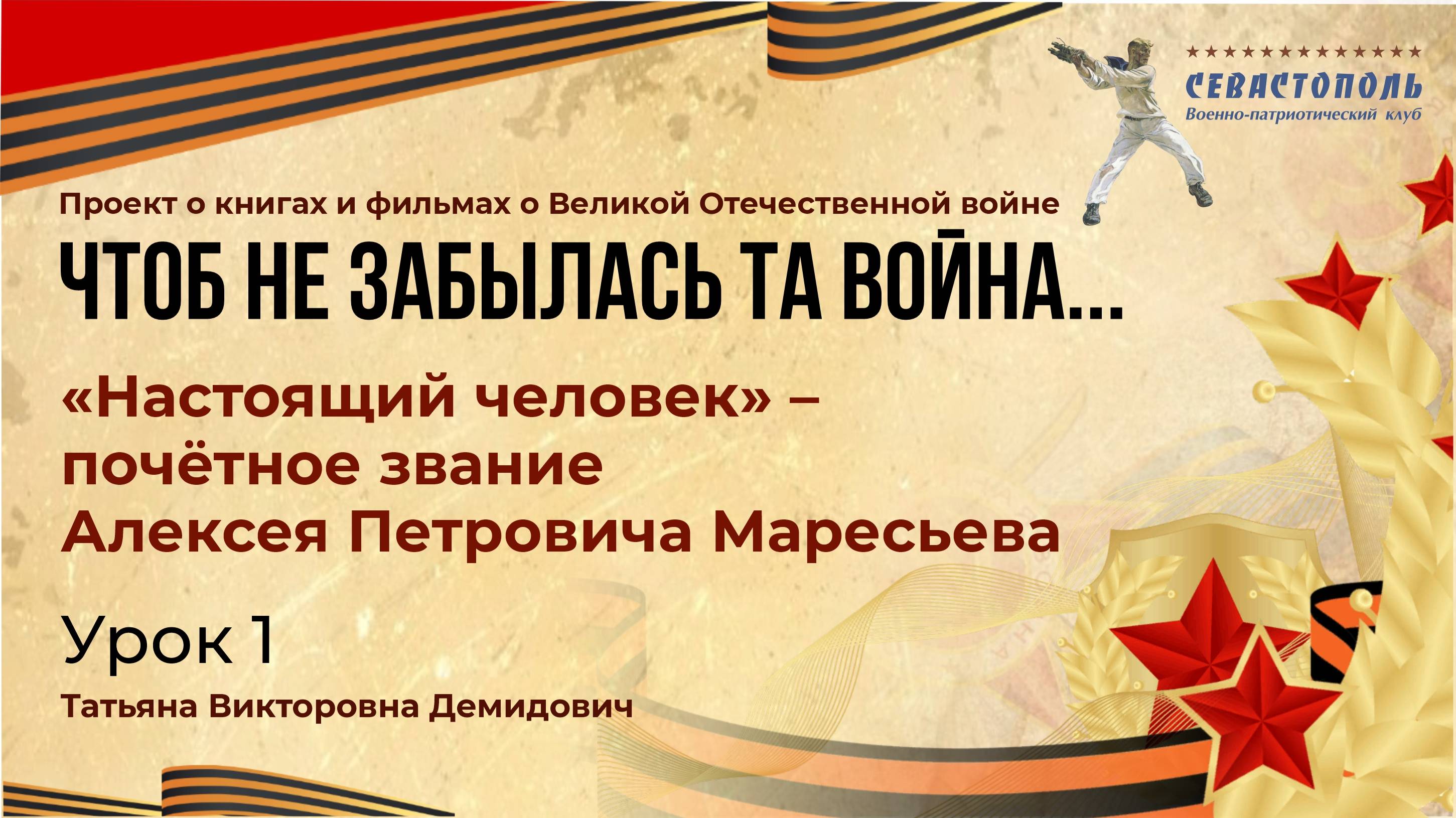 Программа патриотического воспитания «Чтоб не забылась та война» Мотивационное обращение к участникам и организационные вопросы по мероприятию - Дерендяев Александр Владимирович, руководитель ВПК "Севастополь", г. Екатеринбург Встреча (лекция) по теме: 1 часть. Этапы развития советской военно-исторической прозы. 2 часть. "Настоящий человек" - почетное "звание" Алексея Петровича Маресьева. (Б. Полевой "Повесть о настоящем человеке"). Демидович Татьяна Викторовна, старший преподаватель, Институт лингвистики и межкультурной коммуникации, Первый Московский государственный медицинский университет им. И.М.Сеченова г. Москва