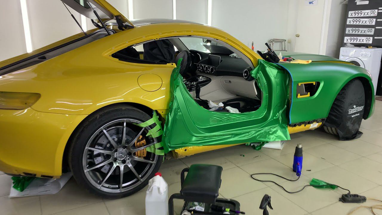 Mercedes AMG GTS - оклейка пленкой зеленого цвета, аквапринт, антихром, бронирование, перетяжка руля