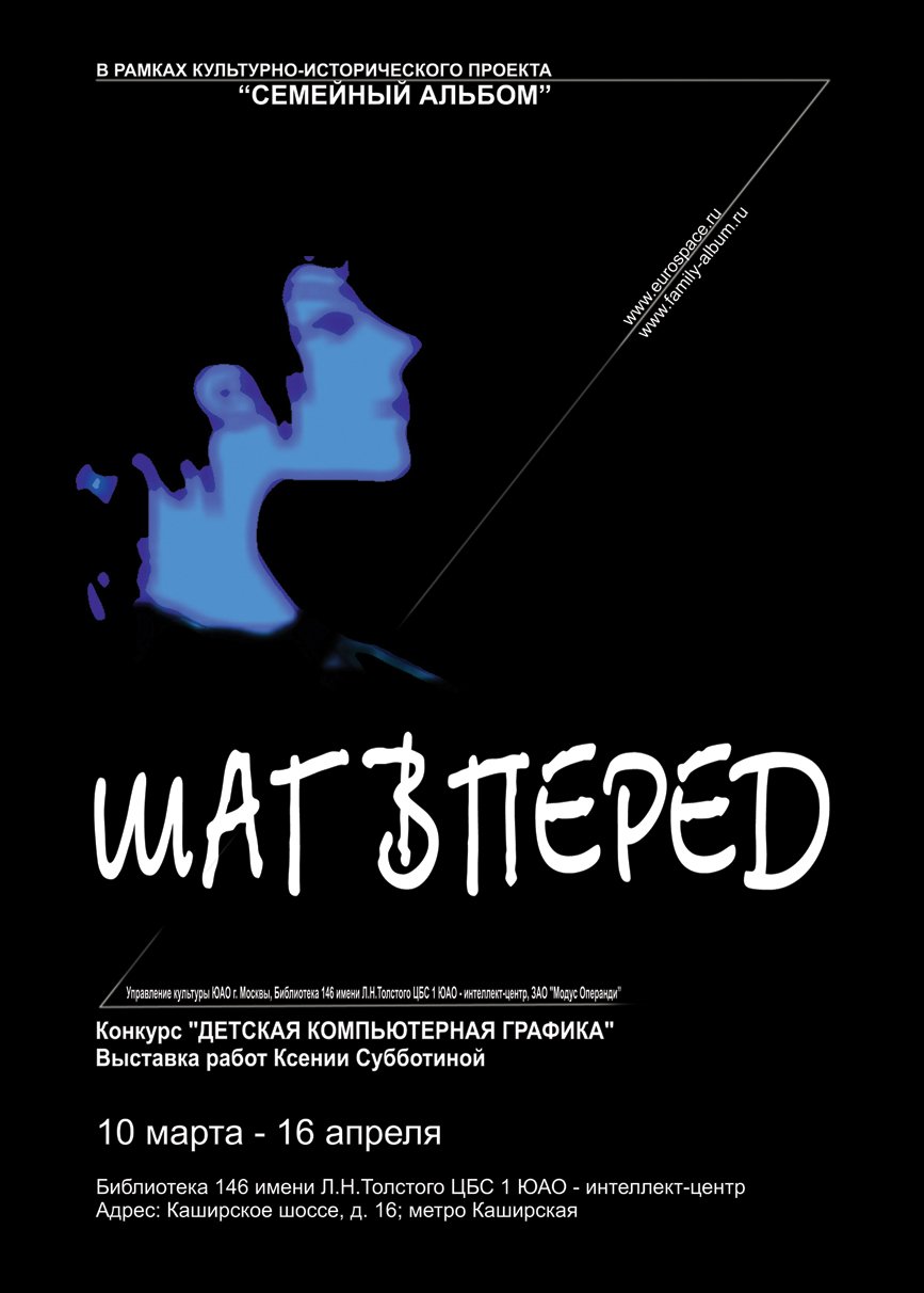 Живые выставки участников проекта «Семейный альбом». Видеоархив. Выставка творчества Ксении Субботиной «Шаг вперёд» в интеллект-центре библиотеки № 146 имени Льва Николаевича Толстого. Март-апрель 2007 года. #familyalbum #exhibition #computergraphics #computergraphicsvideos #photo #andreysubbotin #ksenyasubbotina #culture #history #memories #семейныйальбом #творчество #Фотография #андрейсубботин #ксениясубботина #компьютернаяграфика Видеоролик создан Андреем Субботиным