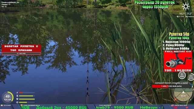 Поддержка донатом https://new.donatepay.ru/@1032463 Альтернативный донат https://www.donationalerts.com/r/kalyamba11 5536913964533059 карта Тинькоф Если стрим лагает,смотри стрим на трово https://trovo.live/s/Kalyamba_na_Ribalke Тг https://t.me/kalyamba_na_ribalke Мой ВК - https://vk.com/kalyantv НИК в игре kalyan11 НАШ ДС https://discord.gg/4ZzSQkQtsK Заказ водоема на 1 час - 500р ( весь стрим 2500р ) Модерка на канале 1300р ( каждая следующая на 100р больше) ✅Призы в рулетке "ЗОЛОТАЯ" 500р ✔ ЗОЛОТО ✔ ПРЕМ ✔ КАТУШКИ РАПТОР 40, ВЕНГИ, ТАЙГА, СИЛЬВЕР 80, И другие ✔ ПАЛКИ ПИЛКЕРНАЯ, ДОНКА МОРСКИЕ, ✔ РОД ПОД, СТУЛЬЯ ✅Призы в рулетке СТАНДАРТ : 100р ✔ катушкИ РАПТОР 40, ВЕНГИ, ТАЙГА, СИЛЬВЕР 80, И другие ✔ катушки 60 для медного ( ЭВИИ, НАТОРЫ, ГОЛДА, и тд) ✔ ПИЛКЕРНОЕ УДИЛИЩЕ КОРОЛЕВА ОКЕАНА ✔ Морское Донное удилище ✔ прем ( 3, 7, 30 дней) ✔ золото ( 1, 3, 5, 10, 20 ,50) ✔ билет на море ( 1, 3, 5 дней) ✔ голд наживка и др. ✅Призы в рулетке "СТАРТОВАЯ" 50р ✔ катушка Венга ✔ катушка "silver80" ✔ катушка "БЕЛЫЙ КАЛИБР" ✔ катушка "Черный калибр" ✔ катушка "Протон" ✔ катушка "Нарга 6000" ✔ Набор Фидерист и спинингист ✔ Карповик Фортуна ✔ фидерные удилища ✔ прем, золото, алкашка, наживки и тд P.s Рулетка это не казино, а награда за поддержку стримера. Вечный ТОП ПОДДЕРЖКИ (10.06.2025) 1. Леха сварной 214 572 2. Dimon_pokemonchik 127 034 3. Skreb79 103 061 4. Interceptor 96 230 5. FishRus86 82 500