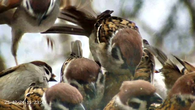 Воробьи в кормушке - большой обед