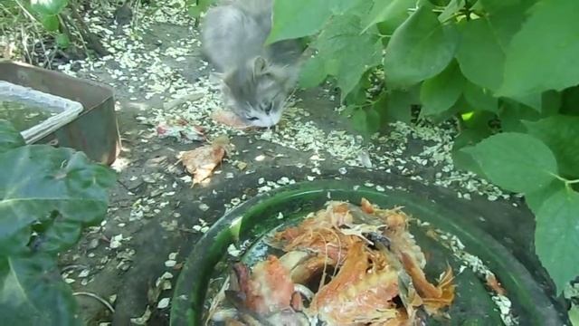 Дача. Вертлявая кошка ест рыбу. Очень милая, пушистая и очень красивая кошка.