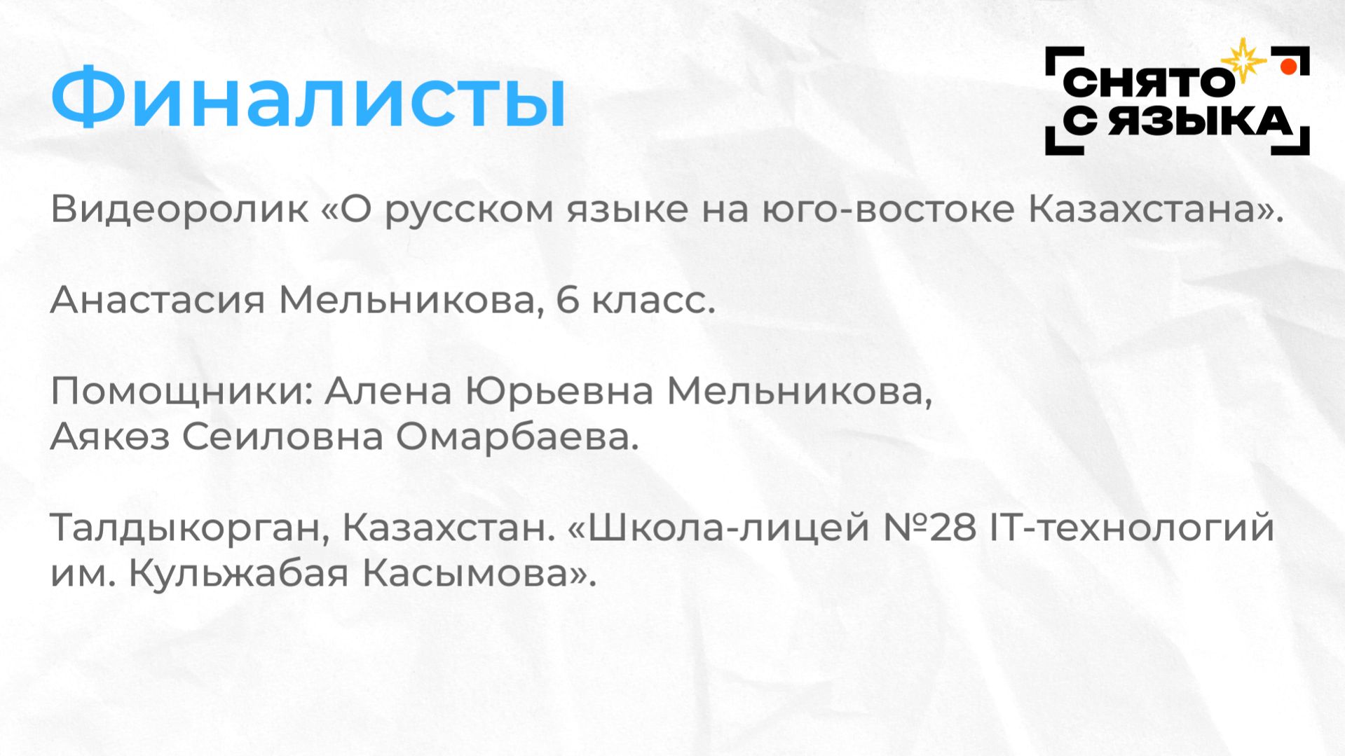 Видеоролик «О русском языке на юго-востоке Казахстана». Анастасия Мельникова, 6 класс. Помощники: Алена Юрьевна Мельникова, Аякөз Сеиловна Омарбаева. Талдыкорган, Казахстан. «Школа-лицей №28 IT-технологий им. Кульжабая Касымова».