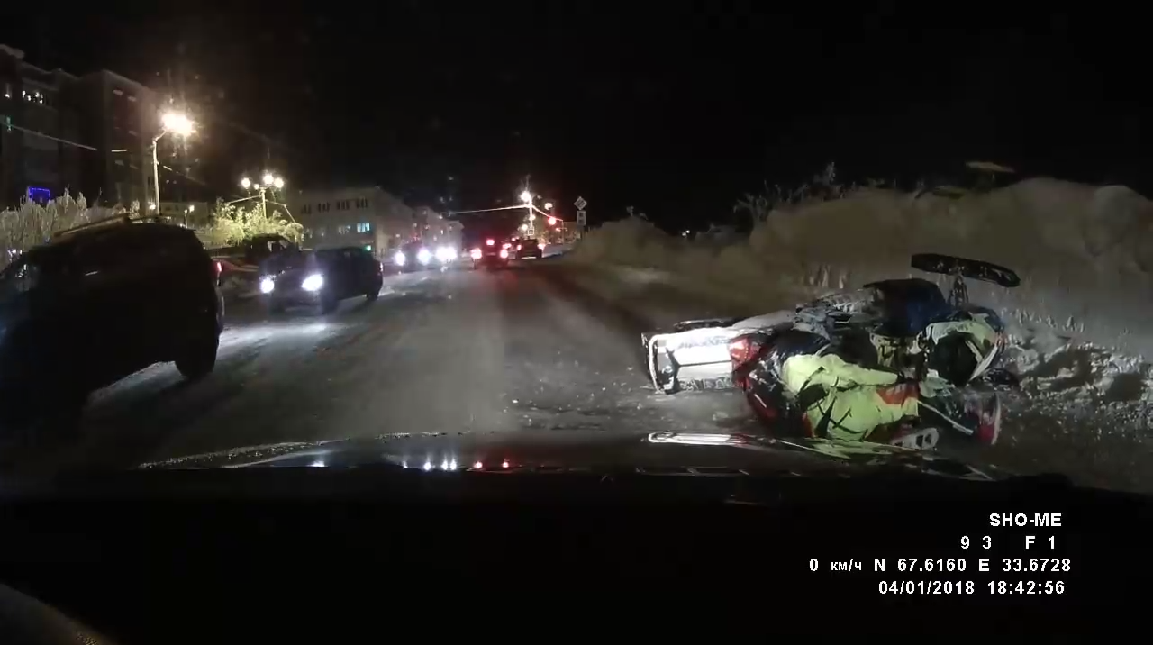 Снегоход упал на дорогу перед машиной, водитель отделался ушибами.
