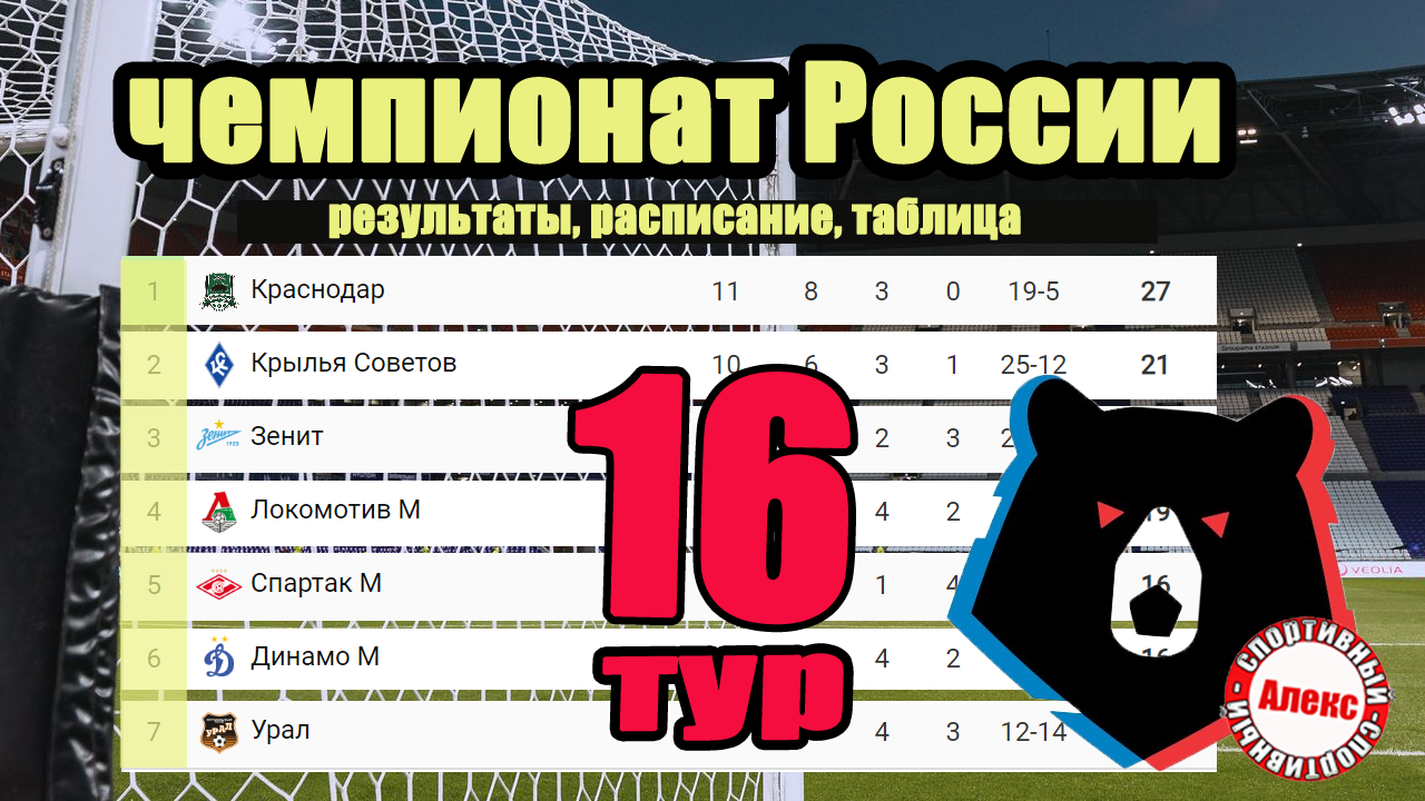 Чемпионат России (РПЛ). 16 т. Результаты. Расписание. Таблица. ЦСКА – Динамо. Зенит обошёл Краснодар