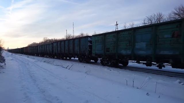 Тепловозы 2ТЭ10У-0401 и 2ТЭ10У-0156 ( дорога приписки: КБШ. Ж. Д., депо приписки: ТЧЭ-3 Пенза (-III) ) с грузовым поездом из 67 полувагонов с углём ( полувагоны с люками в полу - 56; полувагоны с глухим кузовом - 11 ). Дата съёмки: 02.02.2021. Ребята с КБШ. Ж. Д.
