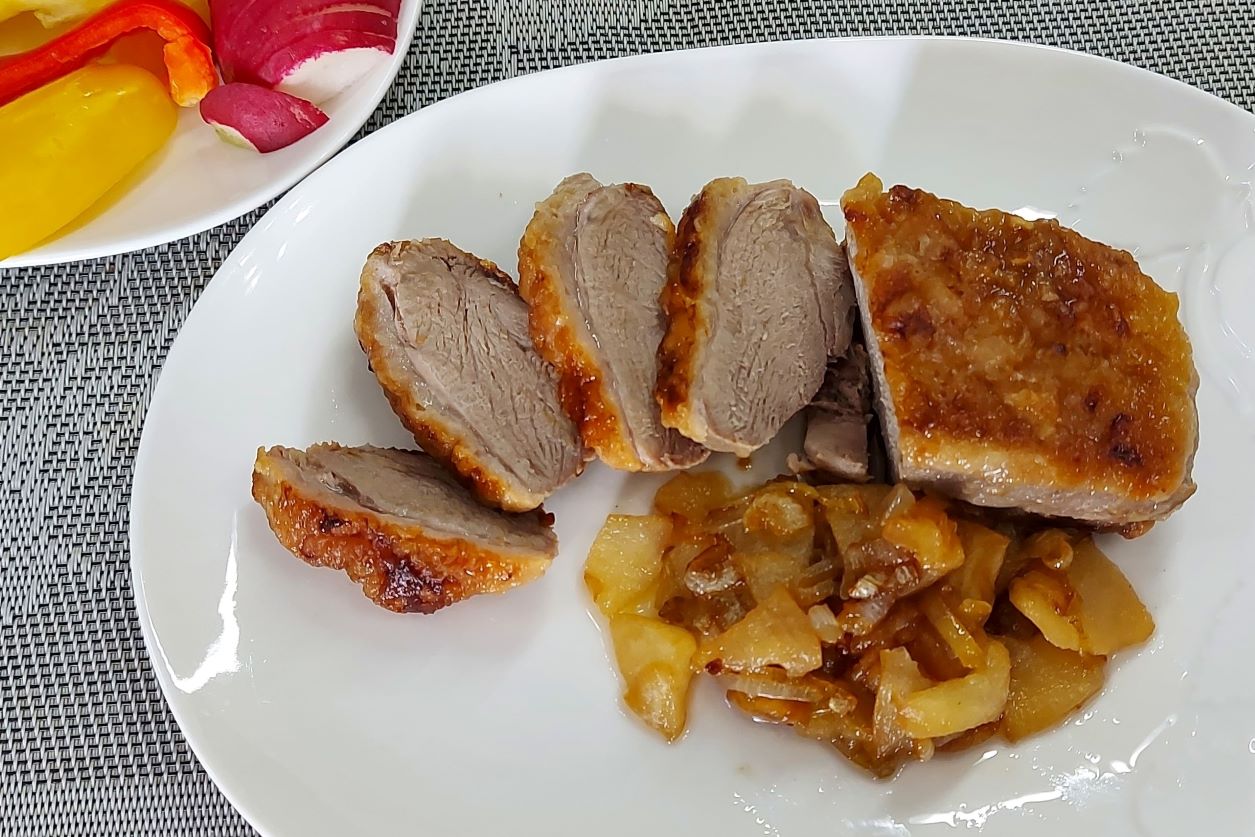 Утка с отличным соусом. Готовлю утиное филе, получилось мягким, нежным, а соус к ней бесподобный. Рецепт: утиное филе 2 шт. мука 1 ст. л. луковица 1 шт. яблоко 1 шт. соль, перец. Готовьте с удовольствием!