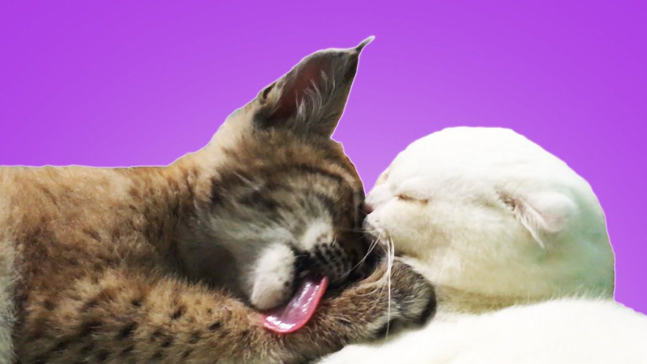 Рысь нежится с белым котом и играет с едой