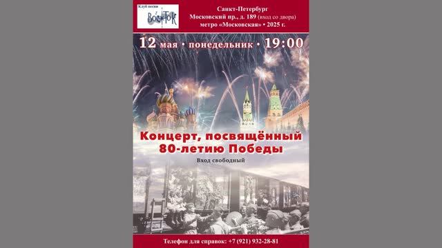 Концерт, посвящённый 80-летию Победы. Ведущая Татьяна Таранец. 12 мая 2025 г. Клуб песни «Восток». Видеозапись - Алла Левитан. Запись звука - Герман Колосов. Афиша - Елена Адрианова. Санкт-Петербург, Московский пр., д. 189. 0:00:00 Позывные клуба «Восток» Светлана Широва 0:00:38 И в День Победы, нежный и туманный… (ст. А. Ахматовой) Дуэт «Синильга»: Тамара Фирсова и Борис Тарасов 0:01:51 Ладога («Ягодой-брусникой в серый вереск…») (В. Вихорев) 0:04:28 В сельском клубе, в вестибюле, на стене… (муз. В. Берковского, ст. Р. Ольшевского) 0:06:38 После дождичка небеса просторны… (Б. Окуджава) Валентин Вихорев 0:11:30 Чтобы в запертой квартире… (ст. В. Вихорева) 0:13:08 Кобона («Кобона – это перроны, склады, составы, вагоны…») (ст. В. Вихорева) Людмила Бойко, акк. Ю. Афанасьев 0:16:05 Мальчиком ушёл он на войну (муз. Я. Дубравина, ст. А. Чепурнова) 0:17:55 Шёл солдат походным строем (муз. Я. Дубравина, ст. В. Суслова) Ирина Балашова 0:21:22 До свидания, мальчики («Ах, война, что ты, подлая, сделала…») (Б. Окуджава) 0:24:27 «Так случилось, мужчины ушли…» (В. Высоцкий) Внучка Светланы Джагашвили Мирослава Виговская, 7 лет 0:29:36 Воспоминание о войне (Юрий Тюлин, прадедушка) 0:: Мой прадед герой! (Елена Никифорова) Светлана Джагашвили 0:33:38 От войны войны не ищут… (ст. Б. Окуджавы) 0:: Поминальное («Наша память бессильна уйти от потерь…») (ст. Б. Окуджавы) Андрей Мариничев 0:37:02 Воспоминание о пехоте («Нас везут в медсанбат…») (Ю. Визбор) Александра Андерсон, акк. И. Яковлев 0:40:38 Военные фотографии («Доводилось нам сниматься…») (муз. С. Никитина, ст. Ю. Визбора) Александр Добров 0:43:10 Генеральская дача (ст. Н. Заболоцкого) 0:46:01 Ты пишешь письмо мне… (ст. И. Уткина) Валентина Зорина 0:48:27 О той весне (Е. Плотникова) 0:51:50 Песни наших отцов (муз. Я. Дубравина, ст. В. Суслова) Михаил Крючков 0:56:06 Купил часы на браслетке я (Б. Окуджава) Любовь и Михаил Крючковы 0:58:11 Простите пехоте (Б. Окуджава) Владимир Фатеев 1:01:21 Песенка низкорослого человека, который остановил девушку у метро Автозаводская (М. Анчаров) 1:04:02 Ты припомни, Россия… (М. Анчаров) Татьяна Таранец 1:06:55 Светлая головушка («День да ночь, рассвет да закат…») (В. Кутузов) 1:10:01 Шло письмо домой с войны… (муз. С. Матвеенко, ст. С. Острового) Юрий Токмаков 1:15:20 Всему времечко своё… (муз. Ю. Токмакова, ст. Б. Окуджавы) Лариса Завальнюк, Леонид Никоноров 1:18:25 Плакала, плакала… (И. Малыгин) 1:20:44 Огонёк («На позицию девушка провожала бойца…») (муз. народная, ст. М. Исаковского) Игорь Яковлев 1:24:43 В белом сне... (Из к/ф «По главной улице с оркестром» (муз. П. Тодоровского, ст. Г. Поженяна) 1:27:40 Мы, друзья, перелётные птицы… (муз. В. Соловьёва-Седого, ст. А. Фатьянова) Лада Вихорева 1:24:47 Четыре года («Четвёртый год подряд война – твой дом, солдат…») (Б. Окуджава) Лада Вихорева и Герман Колосов 1:34:10 Старый вальс («Военное кино – будто в прошлое окно…») (В. Боков) Герман Колосов, акк. В. Рохварг 1:38:12 Махнём не глядя (муз. В. Баснера, ст. М. Матусовского) Наталья Правдина 1:41:04 Алёша («Белеет ли в поле пороша…») (муз. Э. Колмановского, ст. К. Ваншенкина) Дуэт «Рассвет»: Светлана Широва и Юлиан Афанасьев 1:44:20 Рио-Рита («Городок провинциальный, летняя жара…») (муз. И. Кантюкова, ст. Г. Шпаликова) 1:47:38 На солнечной поляночке (муз. В. Соловьёва-Седого, ст. А. Фатьянова) 1:51:06 Ладога («Сквозь шторм и бури, через все преграды…») (муз. Л. Шенберга и П. Краубнера, ст. Петра Богданова) Валерий Рохварг 1:55:53 Композиция «Казаки в Берлине» (Дм. и Даниил Покрасы