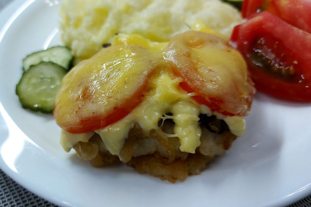 Минтай по-царски. Рецепт: рыба филе 600 гр. лук 180-200 гр. грибы отварные 300 гр. (можно меньше) сыр 125 гр. помидоры майонез мука для панировки 2-3 ст. л. масло растит. Готовьте с удовольствием