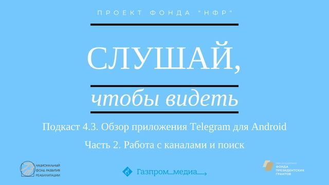 В данной части продемонстрированы работа с каналами и поиск по Telegram. Поиск показан на примере канала проекта Национального Фонда Развития Реабилитации "Слушай, чтобы видеть" в Telegram - https://t.me/heartoseeproject