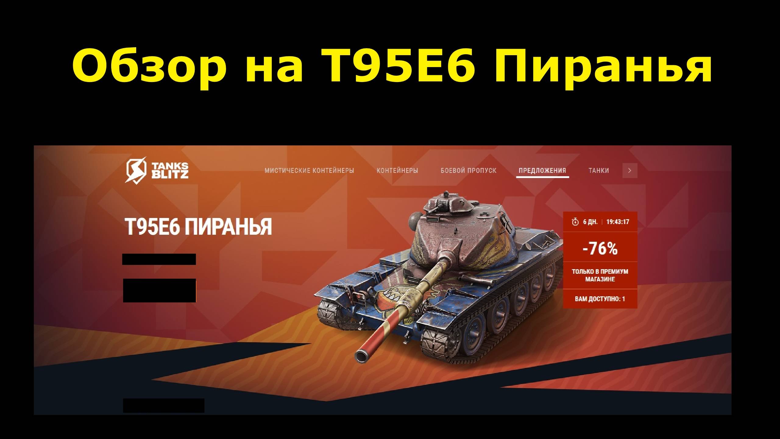 В этом видео я рассказываю о танке Т95Е6 Пиранья, который появился в продаже реальный прайс в игре Tanks Blitz. ✅TanksBlitz Обзоры танков (плейлист): https://rutube.ru/plst/445862/ ✅Мой канал ВКонтакте: https://vk.com/oneshot_play1 ✅Мой канал на YouTube: https://www.youtube.com/@OneShot_Play ✅Мой второй канал по играм: https://rutube.ru/channel/41302499/ Ставьте лайки, рассказывайте друзьям и обязательно комментируйте! =) #wotblitz#tanksblitz#вотблитц#танкблитц#обзортанка#обзор