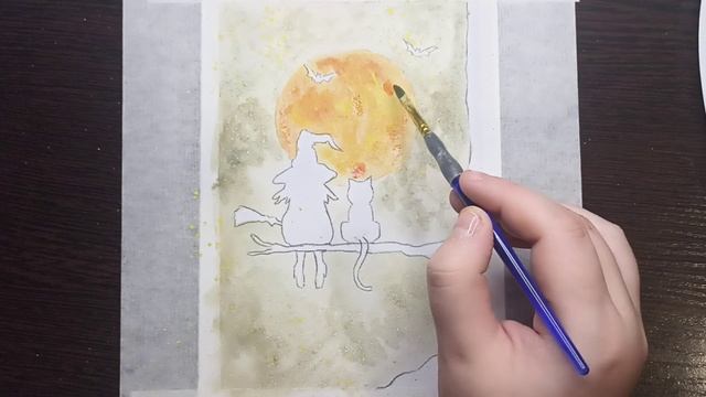 Ведьма с котом / Рисунок гуашью / Рисунок на Хэллоуин