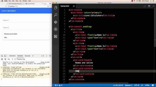 This is the complete Section 2 from my upcoming Ionic 2 by Example course. It will guide you through: * Creating a new Ionic project * Using Ionic components like Inputs, List, Card, Icons * Customising the theme, styles and colours * Using Angular property bindings It assumes you have already installed the latest version of the Ionic CLI; see http://ionicframework.com/docs/v2/getting-started/installation/ You can see the code changes made at each step as Git commits in this repository: https://github.com/mirkonasato/ionic2-by-example/commits/love-calculator Here's an adaptation of the same app on Plunker: http://plnkr.co/edit/LYXYiG?p=preview Get the full course here: http://link.encoded.io/courses/ionic2?source=youtube