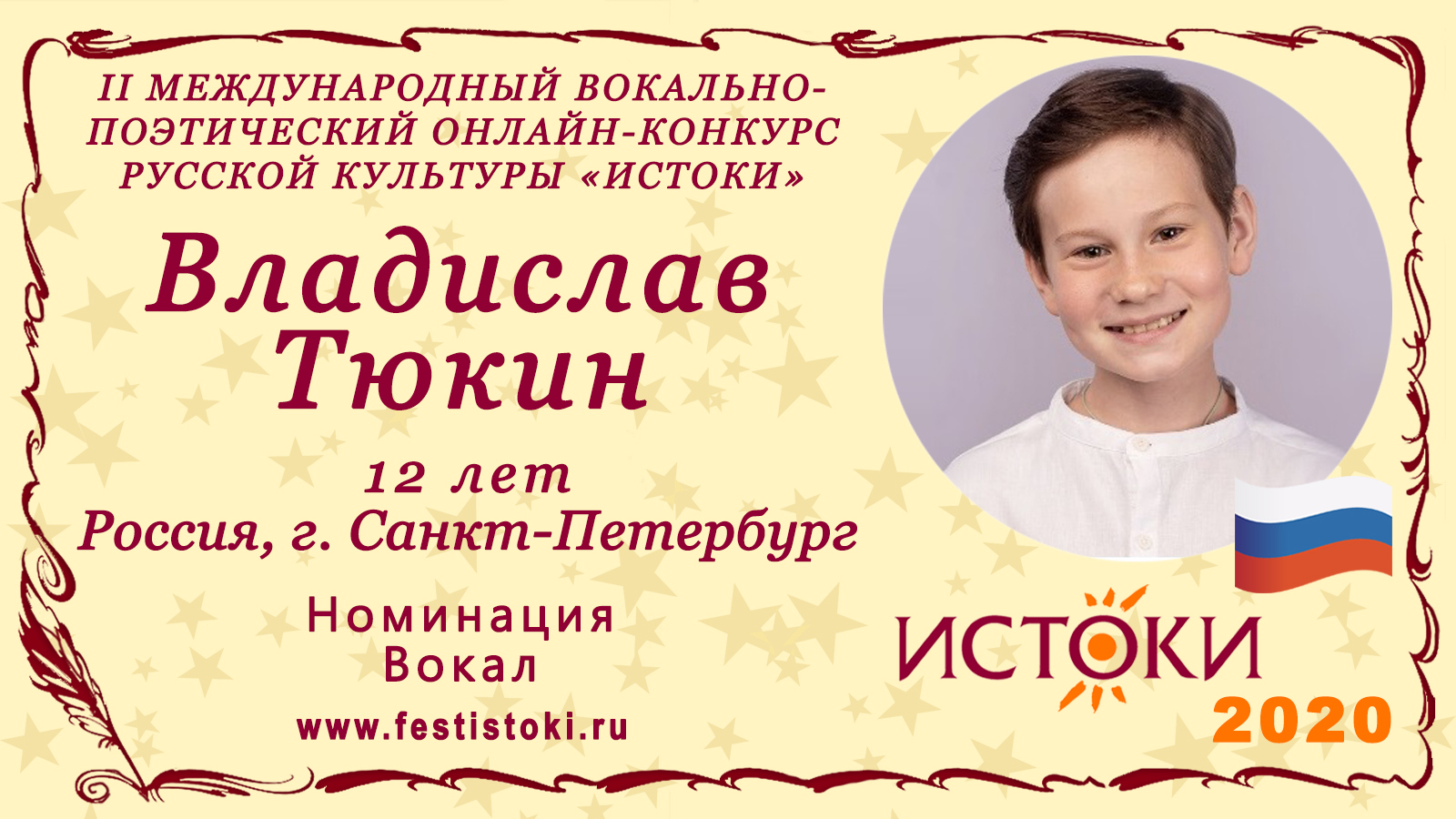 Дипломант II Международного вокально-поэтического онлайн-конкурса русской культуры «Истоки». Номинация - Вокал. Песня "Синяя вечность". Музыка Муслима Магомаева, слова поэта Геннадия Козловского. Сайт: www.festistoki.ru / www.festistoki.com E-mail: festistoki@mail.ru