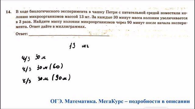 Задание 14. В ходе биологического эксперимента в чашку Петри с питательной средой поместили колонию микроорганизмов массой 13 мг. За каждые 30 минут масса колонии увеличивается в 3 раза. Найдите массу колонии микроорганизмов через 90 минут после начала эксперимента. Ответ дайте в миллиграммах. Тема задания - арифметическая и геометрическая прогрессия / последовательности Группа ВК для подготовки к ОГЭ: https://vk.com/secretroom2023 Видеокурс для подготовки к ОГЭ по математике: https://stepik.org/a/193288