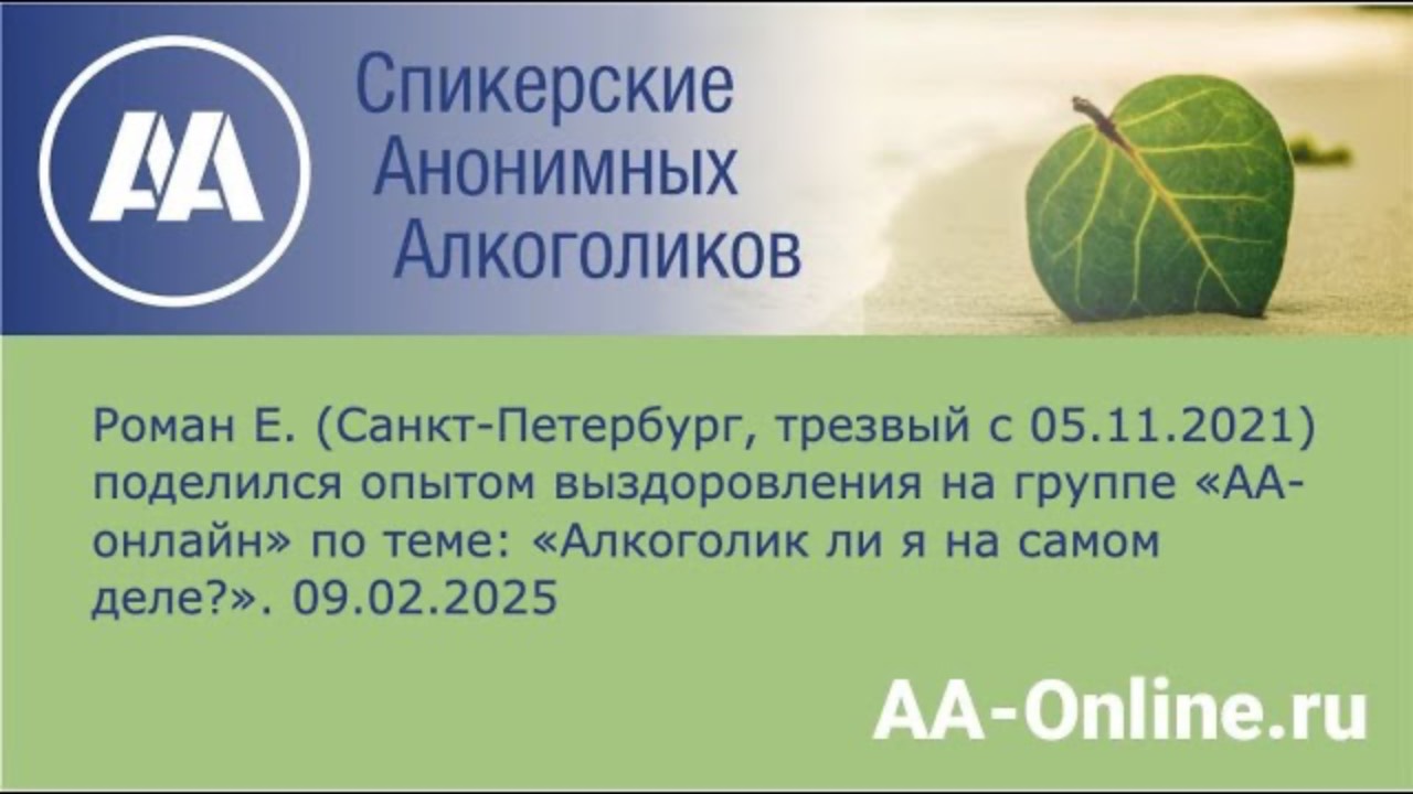 Спикерские выступления на группе Анонимных Алкоголиков АА-Онлайн. Бесплатная Помощь при алкоголизме: https://aa-online.ru/ Литература АА на сайте: https://aa-online.ru/literatura-aa/ Наш канал в телеграмм: https://t.me/AA_Online_ru Мы в ВКонтакте: https://vk.com/aaonlineru Сайт группы Анонимные Алкоголики "АА-Онлайн" https://aaonline.ru/